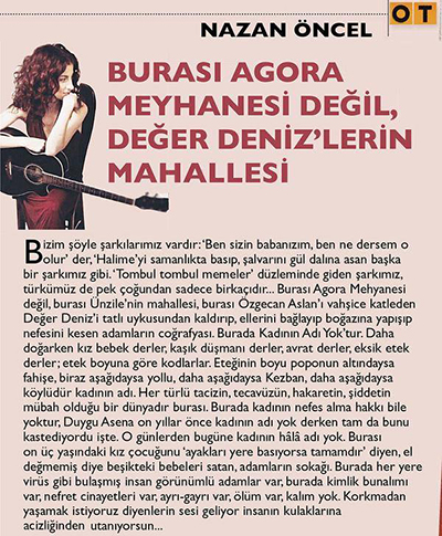 Bizim şöyle şarkılarımız vardır: ‘Ben sizin babanızım, ben ne dersem o olur’ der, ‘Halime’yi samanlıkta basıp, şalvarını gül dalına asan başka bir şarkımız gibi. ‘Tombul tombul memeler’ düzleminde giden şarkımız türkümüz de pek çoğundan sadece birkaçıdır... Burası Agora Mehyanesi değil, burası Ünzile’lerin mahallesi, burası Özgecan’ları vahşice katleden adamların coğrafyası. Burada Kadının Adı Yok’tur. Daha doğarken bize kız bebek derler, kaşık düşmanı derler, avrad derler, eksik etek derler; etek boyuna göre kodlarlar. Eteğinin boyu poponun altındaysa fahişe, biraz aşağıdaysa, yollu, daha aşağıdaysa Kezban, daha aşağıdaysa köylüdür adı. Her şeyi söyler ama bir insan demeyi akıl edemeyiz. Her türlü tacizin, tecvüzün, hakaretin, şiddetin mübah olduğu bir dünyadır burası. Burada bizim nefes almaya hakkımız yoktur ve hiç olmamıştır. Burada on üç yaşındaki kız çocuğunu ‘ayakları yere basıyorsa tamamdır’diyen adamlar vardır, el değmemiş diye beşikteki bebeleri satan, vicdanların dibe vurduğu adamların sokağıdır. Burada her yere virüs gibi bulaşmış insan görünümlü adamlar vardır, burada kimlik bunalımı vardır, ayrı ve gayrı vardır. Burada her şey var, insan gibi yaşama hakkı yoktur. Korkmadan yaşamak istiyoruz diyenlerin feryadı geliyor insanın kulaklarıma acizliğinden utanıyorsun..